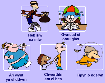 Darllenwch y testun hwn. Mae'n disgrifio beth mae'r athro'n ei wneud er mwyn creu darlun crwn ohono: "Gwych bechgyn!" bloeddiodd Mr Ifans yr athro chwaraeon, a llamu ar y cae efo'i goesau hirion. "Absolutely brilliant!" Doedden nhw ddim yn gwybod eto beth oedd wedi hitio nhw! Wedi dysgu Cymraeg oedd Mr Ifans, tua'r un pryd â phan newidiodd ei enw o Evans i Ifans. Roedd o mor frwdfrydig am bob dim bob amser, ac edrychai'n debyg i ebol efo'i osgo heglog a'i wallt hir. Mae'r dyfyniad hwn yn rhan o stori, felly mae'r awdur wedi gallu disgrifio'n gynnil y ffordd mae'r cymeriad yn ymddangos ac hefyd yr hyn mae'n ei wneud. Dyma sy'n gwneud Mr Ifans yn unigryw! Manylion diddorol Mae'n bwysig manylu ar beth mae'r cymeriad yn ei wneud o ddydd i ddydd. Mae'n debyg i chi sylwi bod pob un ohonon ni'n gwneud pethau bach, unigryw sy'n ein gwahaniaethu oddi wrth bawb arall. ![]() Efallai bod rhai ohonoch chi'n crafu eich talcen pan ydych chi mewn penbleth? Efallai bod ambell un ohonoch chi'n edrych yn gas ar eraill pan mae pethau'n mynd o'i le?Efallai bod ambell un ohonoch chi'n mynd yn welw pan ydych chi'n teimlo'n nerfus? Fel arfer, mae pob un ohonon ni'n eithaf cyson yn ein personoliaeth - yn dueddol o wneud yr un arferion dro ar ôl tro. Y pethau bach hyn sy'n ein gwneud yn unigryw! Idiomau Mae gan bob iaith idiomau sy'n unigryw i'r iaith honno. Gallwn ddefnyddio idiomau i ddisgrifio yn well beth mae'r person neu'r cymeriad yn ei wneud.Darllenwch y disgrifiad hwn. Cerddai Dwynwen yn araf at ei chartref gan ei bod wedi rhoi'r gorau i geisio plesio Mrs Piano. Doedd hi ddim am ganu'r piano byth, byth eto. Roedd hi wedi cael digon! Darllenwch y disgrifiad hwn eto. Beth sy'n wahanol ynddo y tro hwn? Cerddai Dwynwen yn ling-di-long at ei chartref gan ei bod wedi rhoi'r ffidil yn y to i geisio plesio Mrs Piano. Doedd hi ddim am ganu'r piano byth, byth eto. Roedd hi wedi cael llond ei bol! Mae'r idiomau yn amlwg yn datblygu'r disgrifiad ymhellach. Mae'n gwneud y disgrifiad yn llawer iawn mwy diddorol i'w ddarllen. Ysgrifennwch frawddegau yn cynnwys yr idiomau hyn. Darllenwch nhw i weddill y dosbarth.