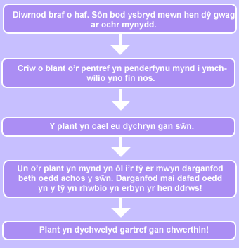 Er mwyn osgoi problemau fel hyn, cynlluniwch eich stori'n ofalus. Mae'n bwysig felly bod gennych chi syniad da cyn dechrau ysgrifennu'r stori. Beth am ysgrifennu stori am: