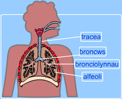 - Gwnewch yn siŵr eich bod yn gyfarwydd â diagram yr ysgyfaint, ac eich bod yn gwybod enwau a swyddogaethau'r tracea, broncws, bronciolynnau ac alfeoli