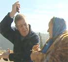 Groeg: Eistedd wrth bwll nofio efo Linda Ganatsiou yn Thesaloniki yn sipian diod felys o'r enw stomacci . . . CLIC . . . Eistedd dan goeden yng Nghreta efo Shirley o Sir Fôn, yn sipian racci ac yn byta siocled, yng nghwmni'r Papas ... ar haul yn machlud . . . CLIC . . . Shirley yn syllu i fyw llygaid y camera ac yn gofyn, "Dad-plis newch chi ddwad draw i'r briodas.