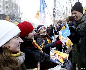 ![]() | Ukrajinci vyšli do ulic Na Ukrajině probíhají mohutné protesty kvůli sporným prezidentským volbám. BBC hovořila v ulicích Kyjeva s příznivci obou táborů, kteří se demonstrací účastní. Nejmohutněji dávají stoupenci opozičního lídra Juščenka svůj názor najevo v hlavním městě Kyjevě, kde se, jako na fotografii, potkávají s příznivci premiéra Junukovyče. | ||