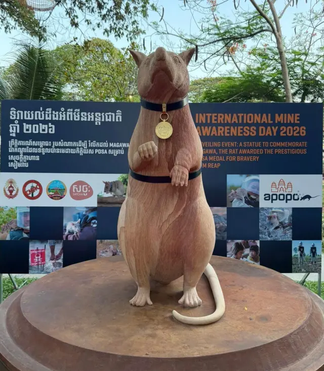 Insiguro y'isanamu, Ishusho y'imbeba Magawa yaconzwe mu bwoko bw'ibuye ryo mu karere k'amajyaruguru ya Cambodia