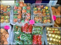 याद पड़ता है कुछ साल पहले तक भारत के एक साधारण शहर में दीवाली पर दस-बीस रूपए में सौ-सौ दीए मिल जाते थे और मूर्तियों के लिए 30 रूपए भी बड़ी बात हुआ करती थी. ख़याल आया कि मिट्टी लंदन की है तो मूर्ति तो महँगी होगी ही. मगर ऐसा नहीं है, न मिट्टी लंदन की थी और न मूर्तियाँ. 'ऑल यू नीड' नाम की दूकान के युवा मालिक भरत ने बताया कि सारी मूर्तियाँ भारत से आती हैं. हाँ पटाखे भारत के नहीं होते. पटाखे सारे चीन के बने होते हैं. चीन के पटाखे रॉकेट, फुलझड़ी, चकरी, अनार सब मिलते हैं, मगर सब चीन के. भारत का सुविख्यात ‘मुर्गा छाप’ यहाँ नहीं नज़र आता. यहाँ दिखता है रेड ड्रेगन. भरत ने बताया,"चीन के पटाखे इसलिए बिकते हैं यहाँ क्योंकि एक तो वे ज़्यादातर आसमान में छोड़े जानेवाले पटाखे होते हैं और साथ ही उनकी कीमतें भी भारतीय पटाखों से कम होती हैं". लंदन में पटाखे छोड़ने की तो छूट है मगर सुरक्षा के ख़याल से ज़मीन पर छोड़े जानेवाले पटाखों के मामले में सख़्ती बरती जाती है. |