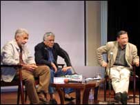 ओम पुरी- "अभिनय सिखाने में इंस्टीट्यूशन की भूमिका होती है, एक्टर तो इंसान के अंदर होता है लेकिन उसे संवारने-निखारने का काम इंस्टीट्यूशन करते हैं. ट्रेनिंग एक्टर को आत्मनिर्भर बनाती है उसे हर बात के लिए निर्देशक (मुंदरा की तरफ़ इशारा करते हुए) पर निर्भर नहीं रहना पड़ता." नसीर- "मैं अपने बचपन से नाख़ुश था, मैं जल्दी से बड़ा होना चाहता था, कोई और आदमी बन जाना चाहता था. मुझे लगता है कि ज़्यादातर एक्टर बचपन में नाख़ुश होते हैं, कोई और हो जाने की लालसा...ओम आप बताएँ..." ओम पुरी- "मैं बचपन में बड़ा शर्मीला था, बहुत कम बोलता था, जब नाटक करने लगा तो लगा कि मुझे अपनी आवाज़ मिल गई. इसके बाद मुझे एक्टिंग का एडिक्शन-सा हो गया." अफ़सोस नसीर-"मुझे दो बातों का अफ़सोस रहा, एक तो मैं रिर्चड एटनबरो की गांधी नहीं कर पाया और दूसरे कभी सत्यजित राय के साथ काम करने का मौक़ा नहीं मिला, ओम पुरी ने दोनों किया. ओम ने माइ सन फैनेटिक की, और अब चार्ली विल्सन्स वार में ज़िया उल हक़ भी बन रहा है." ओम पुरी-"माइ सन द फैनेटिक वाला रोल पहले नसीर को मिला, उन्होंने भुट्टो का रोल करने के चक्कर में वह फ़िल्म छोड़ी तो मुझे मिली, भुट्टो वाली फ़िल्म बनी ही नहीं." नसीर-"गांधी न करने का अफ़सोस बहुत समय तक रहा, लेकिन अब लगता है कि तब गांधी नहीं बना वही अच्छा हुआ, मेरी उम्र बहुत कम थी, मैं अच्छा नहीं कर पाता. बाद में तो 'हे राम' में गांधी बनने का शौक़ पूरा कर लिया." बॉलीवुड नसीर-"इससे बड़ी बेहूदगी कोई नहीं हो सकती, कोई आपको अपमानित करने के लिए 'इडियट' कहे और आप उसको अपना नाम बना लें, ऐसी ही बात है बॉलीवुड कहना. मुझे बहुत नफ़रत है इस शब्द से. इसमें बहुत अपमान है, बॉलीवुड, लॉलीवुड, कॉलीवुड ये सब एक घटिया मज़ाक है."