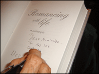 जब प्रेम की बात छिड़ी तो देव आनंद ने बताया कि लोग उन्हें रोमांटिक हीरो के रूप में जानते हैं और ज़िंदगी के साथ उनका रोमांस आज भी जारी है. उनका कहना था, "पूरी ज़िंदगी मैने विचारों के साथ, अपने साथ रोमांस किया है, मेरे साथ काम करने वाली हीरोइनों के साथ रोमांस किया. जब आप काम कर रहे होते हैं तो आपको किसी से तो प्यार करना पड़ता है वरना आप काम कैसे करेंगे." समारोह में आए अमर सिंह ने भी अपनी पुरानी यादों को ताज़ा करते हुए बताया कि वे भी किस कदर देव साहब के दीवाने थे. उन्होंने बताया, मुझे याद है कोलाकाता में लिबर्टी सिनेमा हॉल था. हरे रामा हरे कृष्णा की एडवांस बुकिंग के लिए लंबी लाइन लगी हुई थी. पुलिस को लाठी चार्ज करना पड़ा. कुछ लाठियाँ मैने भी खाई थीं. क्या पता था कि जिनके लिए लाठी खाई थी उनके साथ बैठने का मौका मिलेगा. वहीं जया बच्चन से जब देव आनंद के बारे में पूछा गया तो जैसे निशब्द हो गईं. उन्होंने कहा, "देव साहब के बारे में कुछ बोलना छोटे मुँह बड़ी बात होगी. उनके जैसे कलाकारों के लिए मेरे मन में दिमाग़ में तारीफ़ और श्रद्धा के सिवा कुछ भी नहीं. वे बहुत फॉर्वड लुकिंग हैं. जिन विषयों पर आज फ़िल्में बन रही हैं उस पर देव साहब बरसों पहले फ़िल्म बना चुके हैं." उनकी इसी रोमांटिक छवि का ही जादू था कि लोग परदेस में भी बड़ी संख्या में उनसे मिलने और ऑटोग्राफ़ लेने आए. भारत में जहाँ प्रधानमंत्री मनमोहन सिंह ख़ुद देव आनंद की किताब के विमोचन पर आए थे तो लंदन में ब्रितानी सांसद कीथ वाज़ देव आनंद से उनकी किताब पर ऑटोग्राफ़ ले दो ख़ास लोगों के लिए लेकर गए- ब्रितानी प्रधानमंत्री गॉर्डन ब्राउन और पूर्व प्रधानमंत्री टोनी ब्लेयर. महफ़िल जब ख़त्म होने को थी तो किसी ने देव आनंद से पूछा कि कभी वो ख़ुद को 18 साल का बताते हैं तो कभी 100 साल का... असल में आपकी उम्र है कितनी?तो देव आनंद ने अपने ही अंदाज़ मे जवाब दिया...'आई एम एजलेस, उम्र की सीमाओं से परे हूँ मैं.' |
