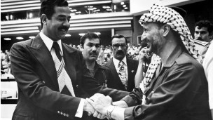 गुटनिरपेक्ष देशों के छठवें शिखर सम्मेलन में इराक के राष्ट्रपति सद्दाम हुसैन से हाथ मिलाते फलस्तीनी नेता यासिर अराफात.