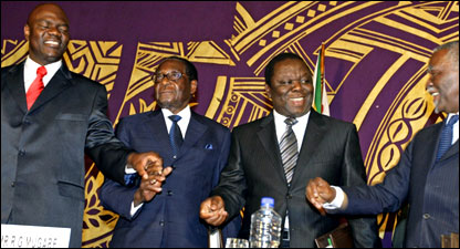 ज़िम्बाब्वे के राष्ट्रपति रॉबर्ट मुगाबे ने लंबे समय से प्रतिद्वंद्वी रहे विपक्षी नेता मार्गन चांगिरई के साथ सत्ता में हिस्सेदारी के ऐतिहासिक समझौते पर हस्ताक्षर किया है. राजधानी हरारे में एक कार्यक्रम के दौरान अफ़्रीकी देशों के प्रतिनिधियों की मौजूदगी में समझौते पर हस्ताक्षर हुए. मार्गन चांगिरई ने कहा है कि समझौते के कारण ज़िम्बाब्वे के लिए उम्मीद जगी है. उन्होंने राष्ट्रपति मुगाबे से अपील की कि समझौते को लागू करने के लिए मिलकर काम करना चाहिए. समझौते पर राष्ट्रपति मुगाबे, विपक्षी एमडीसी के नेता मॉर्गन चांगिरई और एमडीसी से अलग हुए गुट के नेता ऑर्थर मुतम्बारा ने दस्तख़त किए. समझौते के मुताबिक़ चांगिरई को देश का प्रधानमंत्री बनाया गया है. जबकि मुतम्बारा को उप प्रधानमंत्री का पद दिया गया है. समझौते के बाद वहाँ मौजूद क़रीब तीन हज़ार लोगों को संबोधित करते हुए राष्ट्रपति मुगाबे ने कहा, "पहले भी उपनिवेशवाद के ख़िलाफ़ आगे रहने वाले देशों ने ज़िम्बाब्वे को आज़ादी दिलाने में मदद की थी और एक बार फिर इन देशों ने ज़िम्बाब्वे को संकट से निकालने में मदद की है. संकट, जो उपनिवेशवादी शक्ति ब्रिटेन ने खड़ी की है और वह ज़िम्बाब्वे के आंतरिक मामलों में दखल देने की कोशिश कर रहा है." रास्ता उन्होंने कहा कि समझौते में कई ऐसी बातें थी, जो किसी भी नेता को पसंद नहीं थी और अब वे इसका रास्ता निकालने के लिए मिल कर काम करेंगे. उन्होंने कहा कि जब तक सिद्धांतरूप से सहमति बनी रहेगी भविष्य में और समझौते की गुंजाइश भी रहेगी. दूसरी ओर मॉर्गन चांगिरई ने कहा कि इसके लिए कई पीड़ादायक समझौते करने पड़े. उन्होंने यह भी स्पष्ट किया कि इस समझौते से तुरंत ही देश की समस्या का समाधान नहीं होगा. चांगिरई ने कहा, "मैंने इस समझौते पर इसलिए दस्तख़त किया है क्योंकि मैं मानता हूँ कि यह एक समृद्ध, शांतिपूर्ण और लोकतांत्रिक ज़िम्बाब्वे के निर्माण के लिए सबसे अच्छा मौक़ा दे रहा है." उन्होंने अंतरराष्ट्रीय समुदाय और पड़ोसी अफ़्रीकी देशों से अपील की कि वे ज़िम्बाब्वे के पुनर्निर्माण में मदद करें ख़ासकर स्वास्थ्य, शिक्षा और अर्थव्यवस्था के क्षेत्र में.