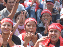 संसद की बैठक कुल आधे घंटे चली जिसमें आंदोलन के दौरान मारे गए 14 लोगों को मौन रखकर श्रद्धांजलि भी दी गई. निचले सदन की बैठक तो हो गई लेकिन संसद के उच्च सदन की बैठक अभी नहीं हो सकी है. संसद की बहाली तीन हफ्तों तक चले आंदोलन के बाद हुई है. इस आंदोलन का आहवान सात राजनीतिक दलों के गठबंधन ने किया था जिसका माओवादी विद्रोहियों ने खुलकर समर्थन किया. राजा ज्ञानेंद्र ने चार साल पहले संसद को भंग कर सत्ता अपने हाथों में ले ली थी और तभी से बहुदलीय लोकतंत्र की स्थापना की मांग हो रही थी. इस महीने की शुरुआत में इस माँग ने आंदोलन का रुप ले लिया था. गुरुवार को राजधानी काठमांडू में जिस विशाल रैली में राजा ज्ञानेंद्र ने संसद को बहाल करने की घोषणा की उसमें कोइराला ख़ुद मौजूद नहीं थे क्योंकि वे गंभीर रुप से बीमार हैं. वे अपनी बेटी के घर पर सांस की बीमारी का इलाज करवा रहे हैं और बिस्तर पर ही हैं. भारत ने स्वागत किया भारत के प्रधानमंत्री मनमोहन सिंह ने गिरिजा प्रसाद कोईराला से फ़ोन पर बात की है और उन्हें भारत की ओर से संसद की बहाली पर बधाई दी है. प्रधानमंत्री के मीडिया सलाहकार संजय बारु ने बीबीसी को बताया कि मनमोहन सिंह ने कोईराला को प्रधानमंत्री बनने की शुभकामनाएँ देते हुए स्वास्थ्य लाभ की कामनाएँ भी की हैं. प्रधानमंत्री सिंह ने कहा है कि नेपाल को वापस रास्ते में लाने के लिए भारत नेपाल की हरसंभव मदद करेगा. उल्लेखनीय है कि नेपाल में लोकतंत्र बहाली के लिए चल रहे आंदोलन को लेकर चिंता जताई थी और नेपाल नरेश ज्ञानेंद्र के पास कर्णसिंह के रुप में अपना दूत भी भेजा था. सैनिकों का अपहरण इस बीच नेपाली सेना ने कहा था कि माओवादी विद्रोहियों ने सेना के 22 जवानों का अपहरण कर लिया है. सेना के अनुसार दक्षिणपूर्वी ज़िले धानकुटा में अपहरण की घटना हुई थी और उस समय सैनिकों के पास हथियार नहीं था क्योंकि वे छुट्टी पर घर जा रहे थे. बाद में माओवादियों ने अपहरण का खंडन करते हुए कहा है कि सैनिकों को किसी भ्रम की वजह से रोक लिया गया था और अब उन्हें रिहा कर दिया गया है. |