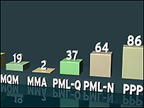 पाकिस्तान में 18 फ़रवरी को चुनाव करवाए गए थे और आधिकारिक तौर पर नतीजे मंगलवार तक घोषित नहीं किए जाएँगे. जीओ टीवी स्टेशन की वेबसाइट के मुताबिक अब तक आए नतीजों के मुताबिक पीपीपी को 86 सीटें मिली हैं और पीएमएल-नवाज़ 64 सीटों पर विजयी रही है. इसका मतलब है कि पीपीपी और पीएमएल(नवाज़) को कुल मिलाकर 272 सीटों वाले संसद में 150 सीटें मिली हैं. इन दोनों पार्टियों के समर्थक सड़कों पर जश्न मनाते दिखाई दे रहे हैं. राष्ट्रपति परवेज़ मुशर्रफ़ को समर्थन देने वाली पीएमएल-क्यू के खाते में अब तक 37 सीटें ही आई हैं. पीएमएल-क्यू ने नेता शुजात हुसैन ने एपी टेलीवीज़न न्यूज़ से बातचीत में कहा कि उनकी पार्टी खुले दिल से नतीजों को स्वीकार करती है और विपक्षी खेमे में बैठने के लिए तैयार है. पाकिस्तान सरकार के कई मंत्रियों को हार का मुँह देखना पड़ा है. ख़बरों के अनुसार राष्ट्रपति मुशर्रफ़ के शासन के दौरान प्रधानमंत्री रहे चौधरी शुजात हुसैन नेशनल असेंबली का चुनाव हार गए हैं. मुशर्रफ़ के विश्वस्त और पूर्व मंत्री शेख़ रशीद अहमद रावलपिंडी सीट से हार गए हैं. वहीं सूबा सरहद में अवामी नेशनल पार्टी को जीत हासिल हुई है और इस्लामिक पार्टियाँ हार गई हैं. मुशर्रफ़ को ख़तरा राष्ट्रपति परवेज़ मुशर्रफ़ ने पहले कहा था कि चुनाव के नतीजे देश की आवाज़ होंगे और जो भी जीतेगा उसे सबको स्वीकार करना होगा. परवेज़ मुशर्रफ़ स्वयं चुनाव में खड़े नहीं हुए थे लेकिन संवाददाताओं का कहना है कि उनके समर्थकों की हार के कारण उनकी स्थिति कमज़ोर हुई है. अगर पीपीपी और पीएमएल(नवाज़) मिलकर गठबंधन सरकार बनाते हैं तो संसद में दो-तिहाई बहुमत के साथ वे मुशर्रफ़ के ख़िलाफ़ महाभियोग प्रस्ताव ला सकते हैं. सोमवार को हुए चुनाव में हिंसा की कई घटनाएँ हुई थीं और करीब 20 लोगों की मौत हुई थी. पीपीपी ने कहा है कि उसके 15 सदस्य भी मारे गए हैं. हिंसा की आशंका के चलते आठ करोड़ में ज़्यादातर मतदाता चुनावी प्रकिया से दूर ही रहे और करीब 40 फ़ीसदी से भी कम मतदान हुआ. ये चुनाव पहले आठ जनवरी को होने थे लेकिन 27 दिसंबर 2007 को एक रैली में पूर्व प्रधानमंत्री बेनज़ीर भुट्टो की हत्या के बाद चुनाव 18 फ़रवरी तक के लिए टाल दिए गए थे. मतदान नेशनल असेंबली की 272 सीटों और प्रांतीय असेंबलियों की 577 सीटों के लिए हुआ था. चुनावों का जायज़ा लेने के लिए दुनिया भर से क़रीब सौ पर्यवेक्षक और पत्रकार भी पाकिस्तान के विभिन्न हिस्सों में पहुँचे हुए थे. |