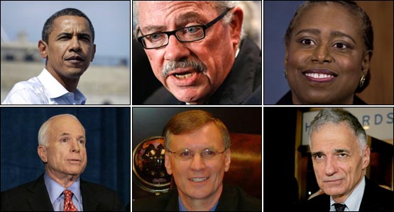 राष्ट्रपति चुनाव में दो मुख्य उम्मीदवार हैं- रिपब्लिकन पार्टी के जॉन मैक्केन और डेमोक्रेटिक पार्टी के बराक ओबामा. इसके अलावा कुछ अन्य छोटी पार्टियों के उम्मीदवार मैदान में हैं. हर उम्मीदावर के अपने-अपने मज़बूत और कमज़ोर पक्ष हैं, सबकी अलग-अलग पृष्ठभूमि है और भविष्य के लिए सबकी अलग-अलग योजनाएँ हैं. अगले कुछ पन्नों में नज़र डालते हैं राष्ट्रपति पद के उम्मीदवारों पर. आलेख: वंदना, बीबीसी संवाददाता | ||||||||||||||||||||||||||||||||||||||||||||||||