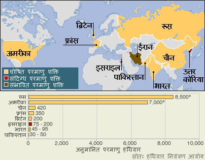 ![]() 6 अगस्त 1945 को एटम बम की अकल्पित शक्ति के मालूम पड़ने के बाद से तो दुनिया में एक तरह से परमाणु हथियारों की होड़ लग गई. शुरूआत अमरीका ने की जिसके बाद कम-से-कम छह अन्य देशों ने खुले तौर पर परमाणु परीक्षण कर स्वयं को महाशक्तियों की पंक्ति में ला खड़ा किया. इसराइल इस बात से इनकार करता है कि उसके पास परमाणु हथियार हैं. उत्तर कोरिया दावा करता है कि उसके पास परमाणु हथियार हैं लेकिन इसका कोई ब्यौरा नहीं है. वहीं ईरान पर ये आरोप लगता रहा है कि वह चोरी-छुपे परमाणु हथियार बना रहा है. | ||||||||||||||||||||||||||||||||||||||||||||||||||||||||||||||||||||||||
