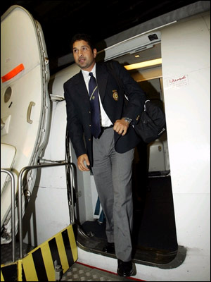 लाहौर के अल्लामा इक़बाल अंतरराष्ट्रीय हवाई अड्डे पर गुरूवार रात विमान से बाहर निकलते सचिन तेंदुलकर.