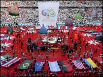 उसके बाद उरुग्वे के पूर्व खिलाड़ी मैदान पर पहुँचे. जर्मनी के राष्ट्रपति होर्स्ट कोहलर, जर्मनी के महान खिलाड़ी फ़्रैंक बेकनबॉवर और फ़ीफ़ा के अध्यक्ष सैप ब्लाटर मंच पर मौजूद थे. राष्ट्रपति कोहलर ने आधिकारिक रूप से विश्व कप जर्मनी में शुरू करने की घोषणा की. इसके साथ ही एक महीने तक चलने वाले विश्व कप की शुरुआत हो गई. पाँच बार विश्व कप जीतने वाली ब्राज़ील की टीम को इस बार भी ख़िताब का बड़ा दावेदार माना जा रहा है. लेकिन अर्जेंटीना, स्पेन, हॉलैंड और इटली का दावा भी कम नहीं. विश्व कप के आयोजकों को उम्मीद है कि विश्व कप के दौरान 10 लाख लोग जर्मनी आएँगे. आकलन ये है कि एक लाख लोग तो इंग्लैंड से ही आएँगे. जर्मनी में विश्व कप के मद्देनज़र सुरक्षा व्यवस्था पर विशेष ध्यान दिया गया है. पुलिस कर्मचारियों की छुट्टियाँ तक रद्द कर दी गई हैं. |