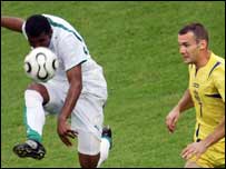 विश्व कप मुकाबले के एच ग्रपु के लिए हुए मैच में यूक्रेन ने सऊदी अरब को 4-0 से करारी शिकस्त दी है. अपने पिछले मैच में स्पेन के हाथों 4-0 से धुलने के बाद इस मैच में यूक्रेन ने कोई चूक नहीं की. इस जीत के बाद अब अगले दौर में पहुँचने की यूक्रेन की उम्मीद एक बार फिर बढ़ गई है. यूक्रेन शुरू से ही खेल में सऊदी अरब पर हावी रहा.पूरे खेल के दौरान यूक्रेन के खिलाड़ी धैर्यपूर्ण लेकिन जोशीले अंदाज़ में नज़र आए. यूक्रेन की ओर से आंद्रेय रुसोल, सरी रेबरोव, आंद्रेय शेवचेन्को और मैक्सिम कालिनीचेन्को ने एक-एक गोल किया. दमदार शुरूआत खेल शुरू हुए केवल तीन मिनट ही हुए थे कि यूक्रेन के डिफ़ेंडर आंद्रेय रुसोल ने यूक्रेन के लिए पहला गोल भी कर दिया. ये विश्व कप में यूक्रेन का पहला गोल था. रुसोल ने सऊदी अरब के गोलकीपर मुबारक ज़ैद की दोनों टाँगे के बीच में से गेंद को गोलक्षेत्र में भेज दिया. सऊदी अरब के खेमें में शुरू से ही घबराहट झलक रही थी. ख़ासकर फ़िसलन वाले हैमबर्ग के मैदान पर सऊदी अरब को काफ़ी दिक्कत हुई. जबकि यूक्रेन के खिलाड़ियों की शैली के हिसाब ये मैदान मददगार साबित हुआ. 24 वें मिनट में सऊदी अरब के खाते में एक गोल जा सकता था जब उसके खिलाड़ी दोखी के एक शॉट की दिशा यूक्रेन के रूसोल के घुटने लगने से बदल गई. गेंद गोलक्षेत्र में जाते जाते बची. पहला हाफ़ ख़त्म होते-होते यूक्रेन के सरी रेबरोव ने दूसरा गोल भी कर दिया. ताइमोचुक ने रेबरोव को गेंद दी और रेबरोव ने बेहतरीन शॉट लगाते हुए गोल कर दिया. इस गोल को बचाने के चक्कर में सऊदी अरब के गोलकीपर ज़ैद फ़िसल गए. पूरे मैच में ज़ैद का प्रदर्शन कुछ ख़ास नहीं रहा. सऊदी अरब का फ़ीका प्रदर्शन