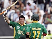 ऑस्ट्रेलिया ने मैथ्यू हेडन, रिकी पोंटिंग और माइकल क्लार्क की धमाकेदार पारियों की बदौलत दक्षिण अफ़्रीका को 84 रनों से हरा दिया है. एक अन्य मुक़ाबले में इंग्लैंड ने कीनिया को सात विकेट से शिकस्त दी है. सेंट किट्स के वार्नर पार्क मैदान पर दक्षिण अफ़्रीकी कप्तान ग्रेम स्मिथ ने टॉस जीत कर ऑस्ट्रेलिया को बल्लेबाज़ी के लिए आमंत्रित किया. फ़ील्डिंग करने का उनका फ़ैसला दक्षिण अफ़्रीकी गेंदबाज़ सही साबित नहीं कर पाए और शुरू से ही ऑस्ट्रेलियाई बल्लेबाज़ों ने फटाफट शैली में ताबड़तोड़ बैटिंग करते हुए निर्धारित 50 ओवरों में छह विकेट पर 377 रनों का विशाल स्कोर खड़ा कर दिया. इसके जवाब में दक्षिण अफ़्रीकी पारी 48 ओवर में 293 रनों पर सिमट गई. हालाँकि इस मैच से दोनों ही टीमों के विश्व कप अभियान पर कोई असर नहीं पड़ा है. दोनों टीमें सुपर आठ में पहुँच गई हैं. दक्षिण अफ़्रीकी पारी जीत के लिए 378 रनों के विशाल स्कोर का पीछा करने जब ग्रेम स्मिथ और एबी डीविलियर्स मैदान पर उतरे तो मैक्ग्राथ जैसे अनुभवी गेंदबाज़ों के भी पसीने छूट गए. दोनों की सलामी जोड़ी ने शानदार शुरुआत करते हुए रन रेट को आठ के आस-पास रखा और दक्षिण अफ़्रीका ने 21 वें ओवर में ही बिना किसी नुकसान के 160 रन बनालिए.