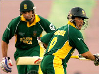 इसके बाद मोहम्मद यूसुफ़ महज दो रन बनाकर चलता बने. युवराज सिंह भी बढ़िया शुरुआत करने के बाद पारी को आगे नहीं बढ़ा पाए और 31 रनों के निजी स्कोर चिगुंबुरा के शिकार बने. उस समय टीम का स्कोर था 72 रन और पाँच विकेट गिर चुके थे. लेकिन इसके बाद जयवर्धने और धोनी ने ताबड़तोड़ बल्लेबाज़ी की और 218 रनों की विशाल साझेदारी निभाई. जयवर्धने 107 रन बनाकर मोर्केल के शिकार हुए जबकि धोनी 139 रनों पर नाबाद रहे. अफ़्रीका एकादश की ओर से ओनगोंडो और मोर्केल ने तीन-तीन विकेट लिए। अफ़्रीका एकादश अफ़्रीका की शुरुआत अच्छी रही. एबी डीविलियर्स और वी सिबांडा ने पहले विकेट के लिए 117 रन जोड़े. डीविलियर्स 70 रन बनाकर मोहम्मद रफ़ीक़ के शिकार बने. इसके बाद रफ़ीक़ ने सिबांडा (45 रन) को भी चलता कर दिया. इनके बाद बोएटा दिपेनार बिना खाता खोले पैवेलियन लौट गए तो स्टीव टिकोलो 11 रन पर हरभजन की गेंद पर आउट हो गए.ट जस्टिन केंप ने पारी को संभालने की कोशिश की लेकिन बाउचर उनका साथ देर तक नहीं निभा सके और सात रन पर धोनी के हाथों लपके गए. पोलक और केंप ने पारी संभालने की कोशिश की लेकिन तब तक जीतने के लिए ज़रूरी रन रेट काफ़ी ऊपर निकल चुका था. केंप 86 रनों पर हरभजन के शिकार बने जबकि पोलक 58 रनों पर नाबाद रहे. एशिया एकादश की ओर से रफ़ीक़ ने चार और हरभजन ने तीन विकेट लिए. | इससे जुड़ी ख़बरें ग्राहम फ़ोर्ड भारतीय टीम के नए कोच09 जून, 2007 | खेल की दुनिया मनिंदर सिंह घायल, अस्पताल में भर्ती08 जून, 2007 | खेल की दुनिया ग्राहम फ़ोर्ड को कोच के लिए बुलावा05 जून, 2007 | खेल की दुनिया जमैका पुलिस ने टिप्पणी से इंकार किया02 जून, 2007 | खेल की दुनिया एफ़्रो-एशिया कप का संकट टला31 मई, 2007 | खेल की दुनिया ज़ी टीवी के पीछे हटने से सिरीज़ संकट में30 मई, 2007 | खेल की दुनिया तेंदुलकर एफ़्रो-एशिया कप से हटे28 मई, 2007 | खेल की दुनिया | |||||||||||||||||||||||||||||||||||||||||||||||||||||||||||||||||||||||||||||||||||||||||||||