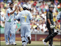 इससे पहले भारत के 258 रनों के जवाब में ऑस्ट्रेलिया की शुरूआत अच्छी नहीं रही थी. उसके शुरूआती तीन विकेट नौवें ओवर में महज़ 32 रन के स्कोर पर ही गिर गए थे. ये तीनों विकेट प्रवीण कुमार ने लिए थे. प्रवीण ने सलामी विकेटकीपर-बल्लेबाज़ एडम गिलक्रिस्ट को मैच के पहले ही ओवर में दो रन के निजी स्कोर पर धोनी के हाथों कैच कराया. इसके बाद तीसरे ओवर में प्रवीण ने कप्तान रिकी पॉंटिंग को महज़ एक रन के निजी स्कोर पर पवेलियन लौटा दिया है. उनका कैच युवराज ने लपका. उस वक्त ऑस्ट्रेलिया का स्कोर आठ रन था. प्रवीण ने मैच के नौवें ओवर में माइकल क्लार्क को 17 रनों के निजी स्कोर पर क्लीन बोल्ड कर दिया. उस वक्त ऑस्ट्रेलिया का स्कोर 32 रन था. इसके बाद मैथ्यू हेडन ने एंड्रूयू साइमंड्स के साथ मिलकर पारी संभाली और स्कोर सौ के पार पहुंचा दिया. 26 वें ओवर में हेडन 55 रनों के निजी स्कोर पर रनआउट हो गए. इसके बाद साइमंड्स भी नहीं टिक सके और अगली दो गेंदों के बाद ही उन्हें हरभजन सिंह ने एलबीडब्लू आउट कर दिया. उस समय ऑस्ट्रेलिया का स्कोर पांच विकेट पर 123 रन था. साइमंड्स और हेडन के आउट होने के बाद जेम्स होप्स और माइक हसी ने पारी को संभालने की कोशिश करते हुए महत्वपूर्ण 50 रनों की साझेदारी की लेकिन 42 वें ओवर में हसी के आउट होने के बाद ऑस्ट्रेलिया की उम्मीदों पर पानी फिर गया. हसी ने 44 रन बनाए और उन्हें श्रीसंत ने धोनी के दस्तानों में कैच करवाया. इसके बाद बल्लेबाज़ी करने आए ब्रेट ली को प्रवीण कुमार ने सात रनों के निजी स्कोर पर बोल्ड कर दिया. इस वक्त मेज़बान टीम का स्कोर सात विकेट पर 228 रन था. 49वें ओवर में श्रीसंत ने मिशेल जॉनसन को धोनी के हाथों कैच करवाया. उस समय ऑस्ट्रेलिया के 238 रनों पर आठ विकेट गिर गए थे. आखिरी ओवर में गेंदबाज़ी की बागडोर इरफ़ान पठान ने संभाली. पठान ने ओवर की दूसरी गेंद पर ब्रेकन को और चौथी गेंद पर होप्स को पीयूष चावला के हाथों कैच करवाया. होप्स ने 63 रन बनाए. भारतीय पारी