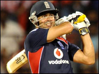सचिन ने वीरेंदर सहवाग के पारी की शुरुआत की. लेकिन वे ज़्यादा नहीं चले और सिर्फ़ 11 रन बनाकर पवेलियन लौट गए. लेकिन उसके बाद वीरेंदर सहवाग और गौतम गंभीर ने शानदार बल्लेबाज़ी की. भारत का स्कोर जब एक विकेट पर 82 रन था, उस समय बारिश आ गई और मैच रोकना पड़ा. मैच जब दोबारा शुरू हुआ, तो उसे 44 ओवरों का कर दिया गया. लेकिन जब भारत का स्कोर एक विकेट पर 106 रन हुआ, फिर बारिश आ गई और मैच रोकना पड़ा. इस बीच सहवाग ने वनडे में अपना 32वाँ अर्धशतक पूरा किया. लंबे समय बाद जब मैच फिर शुरू हुआ तो ओवरों की संख्या घटाकर 22 कर दी गई. भारतीय बल्लेबाज़ों के सामने तेज़ी से रन बटोरने के अलावा कोई विकल्प नहीं था. इसी कोशिश में सहवाग, गंभीर और कप्तान धोनी आउट हुए. इंग्लैंड की ओर से ग्रैम स्वान ने दो विकेट लिए. जबकि स्टुअर्ट ब्रॉड और समित पटेल को एक-एक विकेट मिला. |