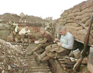 Daytime in the trenches were usually quiet, dawn and dusk were the most common times for an attack. This panorama shows a recreation of a typical day in the trenches, the soldiers are cleaning their weapons to maintain combat readiness. The scene is a recreation for the series 'The Trench'.