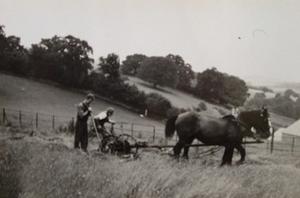 photograph of two men, a horse and a plough in a field in the area around Chagford, Devon - 1940.