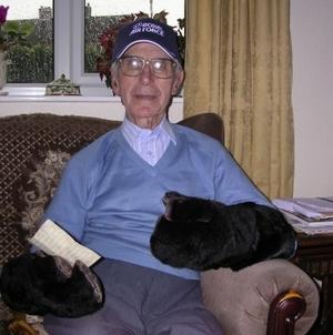 Ted (on his 95th birthday) with his gloves and note from the Russian Major.
