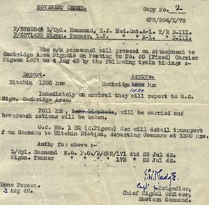 Since the age of 11 my father had raced pigeons. He had been born in the Custom House in Peterborough and volunteered for the armed forces in his 30’s.He joined the Signals. He was a Lance Corporal. He was due to go to Singapore but was called back because of his knowledge of pigeons. He was then deployed to a loft and at one time he was transferred to the lofts in Trafalgar Square. He was sent to Cairo and to Bagdad where messages were sent by pigeon to the Russian convoys. At one point he was sent to Guernsey in a very small boat with pigeons to give to the Resistance on the Channel Islands. He always said that people thought that pigeons couldn’t fly at night but they could. They weren’t much good after they had done so but they could be used at night. His expertise with pigeons saved his life because had he gone to Singapore he would have been killed with all his platoon who unfortunately did not survive. He was demobbed in Berlin at the end of the war. He continued to race pigeons, winning many cups, until he was 86.