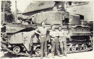 The photograph is of Ken Chapman on the left [Kettering, Northants], Bill Warren [Birmingham], Roy Stacey [Gloucestershire]. The photograph was taken on 4th May, 1945, cease fire 08:00hrs, Grossenhian, North West Germany