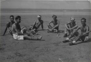 Doug Dawes (far right) with hockey comrades, late 1945, on the beach at Juhu, Bombay
