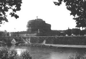 With the war in Italy almost over,Tom and I were able to take advantage of the generous leave given to us by a grateful work shop commander.We had spent a fruitful morning in St.Peters Cathedral and had chosen to rest for a little while on a seat in the Borgasia Gardens which provided the delightful view over the Piazza Delpopolo.The scene showed the background over the Tiber bridge, separating St.Peters on the left and the Castel St.Angelo on the right.