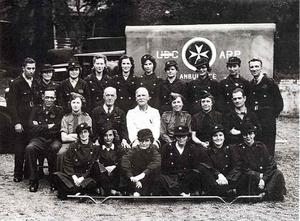 The Hitchin ARP team is seen posing in front of their ambulance outside the Woodside Hall in Hitchin, Hertfordshire.