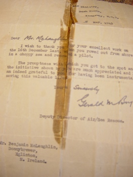 This is the actual letter Ben Mc laughlin received from the ministry in thanks for saving the pilot who crashed in the Foyle