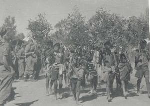 Nagas passing through 'C' Company lines at Maram Rest Camp carrying branches to indicate they come in peace. Taken by CQMS Fred Weedman, 1944