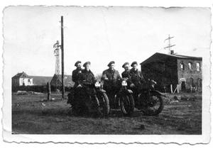 The photo was taken at the same location as Ambulance Control Car and is of Three of dispatch riders, Buster ? the fourth was out somewhere. Starting from the left is Wally Neat the senior of the Drs his passenger for purpose of the photo was one of the company Medics, next Robo Robinson, then myself, Tommy Handley passenger the cookhouse lad that joined the company with me at Nimagen I forget his name