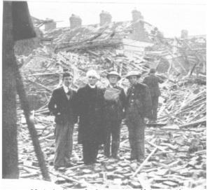 The photograph is reproduced from “Bombs on Belfast”, a publication of W. & G. Baird, which appeared later in the Summer of 1941. The setting is Thorndyke Street, a very short distance from our Church. My father had a parishioner family there and we are standing alongside the site of their house, but just before the photographer arrived, the ARP Warden (with respirator on chest) had assured us that the family had evacuated some time before the raid. In the picture we are standing on the remnants of a street Air Raid Shelter. The bomb had actually fallen among the houses in the background of the picture, but the shelter had been badly built and so was demolished, the reinforced concrete roof crushing all eleven people inside.