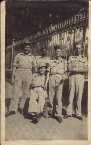 Pat O'Brien (left) at Esbeya Gardens, Cairo, August 1942 while on a few days welcome leave. Pat remembers the fellow 3rd left was the cook, the fourth left was called Aubrey, but cannot remember the names of the other two. [Photograph from collection of Pat O'Brien]