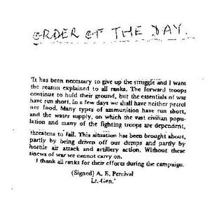 Although our defence was sturdy we were running out of the sinews of war. Also, apart from a comparatively small amount of water in the MacKitchie Reservoir, the main water supply to the island came from the mainland and was, therefore, in Japanese hands. The significance of these factors is reflected in Lt General Percival’s Order of the Day, as shown at the start of my entry.