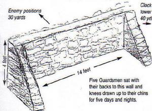 After a sleepless night of being constantly shelled and machine gunned, dawn revealed the precarious position the section had to hold. The wall, four feet high by fourteen feet long, had no overhead cover. The men sat with their backs to the enemy, "It was like trying to fly an aeroplane when facing its tail." During the hours of daylight, the men sat with their knees drawn up to their chins, fearing that being stretched out they could be seen by the enemy on the slopes of Monte Cassino. The toilet they used was a steel helmet with the inside harness removed. They performed Charlie Chaplin contortions when using it and, often, they were rudely interrupted by enemy shelling when doing so.