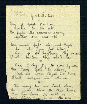 Radio Foyle has had the help of the public Record office Northern ireland in gathering stories and memories for the Peoples War site. earlier this year archivists from proni went to beragh in County tyrone to pick up old school records from beragh primary school amongst the leaves of the registers they found some poems written by the children of Lincoln Memorial School during the war years - this is a poem called Great Britain by billy foster aged 12