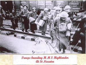 I joined 666 Artisan Works Company Royal Engineers and by the end of February, we were with the B.E.F. in France. We didn’t know about Dunkirk, but in June 1940, we were evacuated from the port of St. Nazaire by a destroyer, the H.M.S. Highlander, and were to board the H.M.T. Lancastria. However, from the crowded deck of the destroyer, we saw The Lancastria bombed. We were hastily moved onto a coal boat, The City Of Mobile, after which we took no further action in the rescue operation.