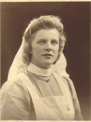 I was encouraged by my friend, Freda Brown, to volunteer to be a nurse and so went to Bishop Auckland to train. The uniform was Air Force Blue and I was given a rain coat with a badge, a blue velour hat with a red band and badge, a blue dress with white cuffs and collar, an apron and a veil ~ the laundry shop on The Bank washed my uniform. After training I came to the Richardson Hospital when it opened.