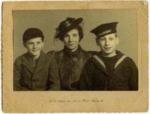 Taken in Portsmouth during the latter part of the War, a photo of my Mother, brother Ernie (in his Naval boy's school uniform), and myself in cap.