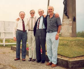 At the Icarus Memorial, Crew Reunion 1960s. L to R: Boris Threadgold (Bomb Aimer), Les Landells (Pilot), Albert 'Bud' Storey (Navigator), Pat Dwyer (Wireless Operator).
