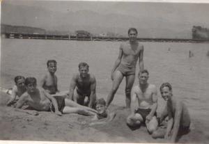 Len Thacker, extreme right, with shipmates from HMS Thruster, at "their awimming pool", the bay of Porto Vecchio, Corsica.