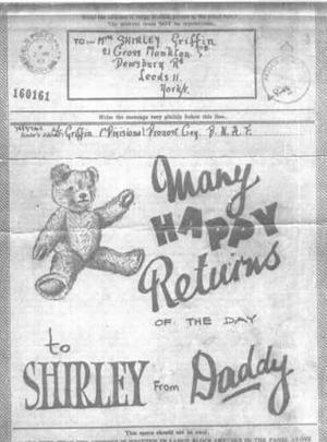 I remember the day we got the telegram. My mother was at work and we children were clearing up after mixing ourselves cocoa and sugar(a wartime treat in place of sweets) when there was a knock at the door. It was a boy on a bicycle from the Post Office with a telegram for my mother.I took the telegram from the boy, not realising the implication of the black band round the envelope. I put it on the shelf over the fireplace ready for when my mother came home from work. It must have been awful for her to walk in and find that telegram waiting for her. She was now a widow with three children and life changed completely. After all these years I still have a greetings telegram that arrived shortly after for my 10th birthday, a letter of condolence from the king and a Christmas card I had made at school which was returned with his personal possessions. I have also managed to visit his grave in North Africa.