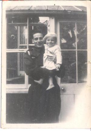 A photo taken of my father Bill Pope and me Douglas Pope in his arms. I think I am around one years old in this photo and this is the first time I remember meeting my father who was home from the army on leave. It was taken at the back of our house in Rushden, Northamptonshire.