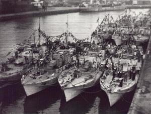 This picture was taken by me from the top of the water tower at Great Yarmouth. it shows the 63rd Motor Torpedo Boat flotilla dressed to celebrate VE Day. MTB 753 is the boat tied up alongside the jetty, with some of my shipmates on the fo'c'sle.