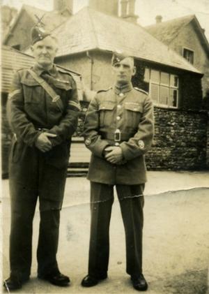 Corporal (later Sergeant) Matt Devlin and RQSM James ‘Bish’ Burney (right), two ‘old soldiers’ of the Border Regiment. They served in the 8th (H.D.) Battalion during the early part of WW2 and are wearing the ribbons of their WW1 medals. [Photograph used by courtesy of Mr Raymond Devlin]