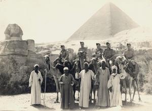 Advance party of wireless operators who manned the sets on the ships used in the invasion of Sicily. On leave from Port Tewfik - at the Pyramids at Giza. 3 June 1943 — prior to the invasion of Sicily. Allan Stoddart on right, on camel.