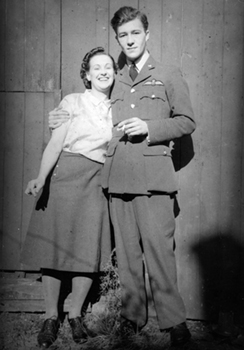 PILOT OFFICER GORDON CONWAY AND HIS FIANCEE ENID CYNTHIA DAVIES IN AUGUST 1941 CELEBRATING THE WINNING OF HIS PILOT'S 'WINGS'.