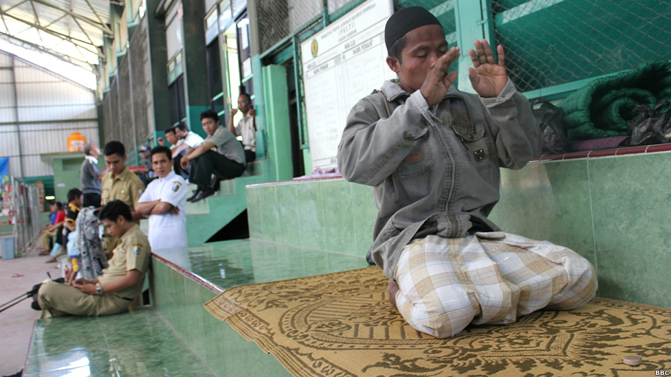 Seorang warga Islam Syiah menatap serius usai shalat Asyar di lokasi pengungsian. "Saya tidak bahagia selama tidak bisa pulang ke kampung," kata seorang pengungsi warga Islam Syiah, seperti dikutip seorang relawan. Tetapi Pemda Sampang melarangnya karena alasan keamanan.